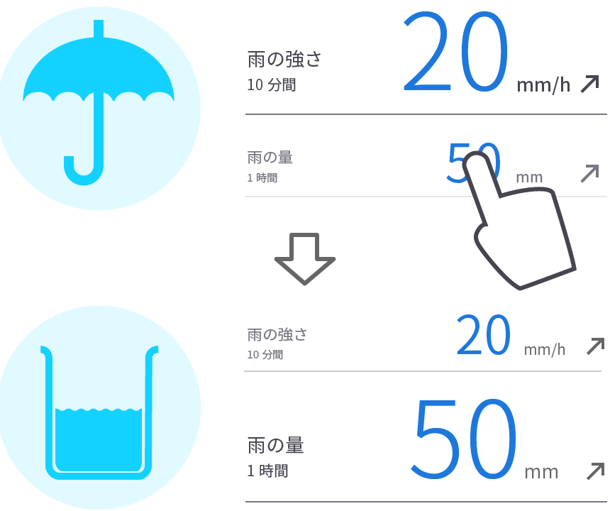 | 50以上〜80未満 | 非常に激しい雨 | 1時間続いたときにはマンホールから水が噴出したり地下街に雨水が流れ込む場合がある |